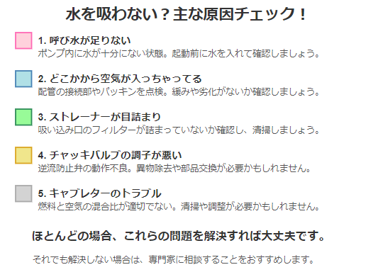 実は、エンジンポンプが吸水しない原因はいくつかあるんです。呼び水が足りなかったり、ポンプにエアが入っちゃったり、ストレーナーが目詰まりしていたり…。でも、心配しないでください!多くの場合、ちょっとしたコツで解決できちゃうんです。