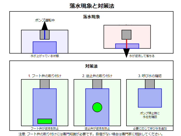 落水現象って聞いたことありますか?ポンプを止めたときに、配管の中の水が逆流しちゃう現象のことなんです。これが原因で、次に使うときに水を吸い上げられないことがあるんです。
