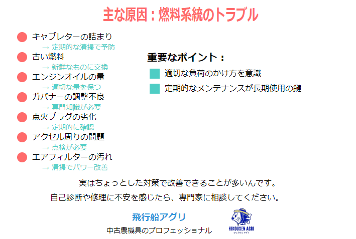 エンストの原因はいろいろありますが、主にエンジンへの負荷やガバナーの調整不良が関係していることが多いんです。また、単純にパワーが出ないという症状も、同じような原因で起こることがあります。