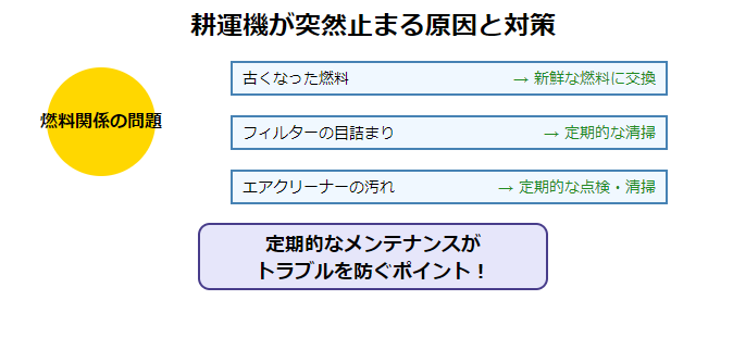 耕運機が突然止まっちゃう原因、実はいくつかあるんです。よくあるのが燃料関係の問題。