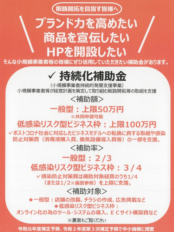 - 経済産業省が実施する制度で、小規模事業者の事業継続を支援することを目的とした資金援助です。