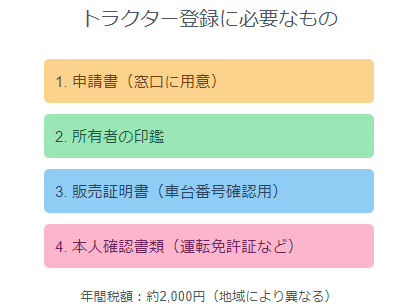 費用は地域によって若干異なりますが、農耕作業用の場合、年間税額は通常2,000円程度です。これは一般的な自動車と比べるとかなり安価です。初回登録時に別途手数料がかかる場合もありますが、数百円程度です。