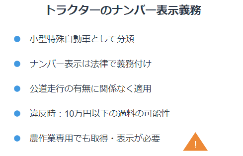 小型特殊自動車として分類されるトラクターは、ナンバーの表示が法律で義務付けられています。これは道路運送車両法に基づく規定で、公道走行の有無に関係なく適用されます。