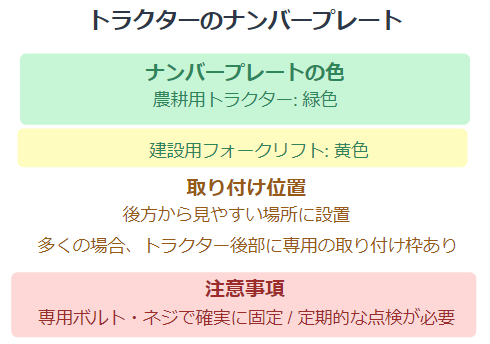 農耕用トラクターのナンバープレートは、一般的に緑色です。これは、農業用の小型特殊自動車であることを示しています。一方、建設用のフォークリフトなどは黄色のナンバープレートが使用されます。