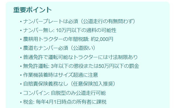 また、雇用主が無免許の従業員にトラクターを運転させた場合、雇用主も処罰の対象となる可能性があります。従業員の免許確認も忘れずに行いましょう。