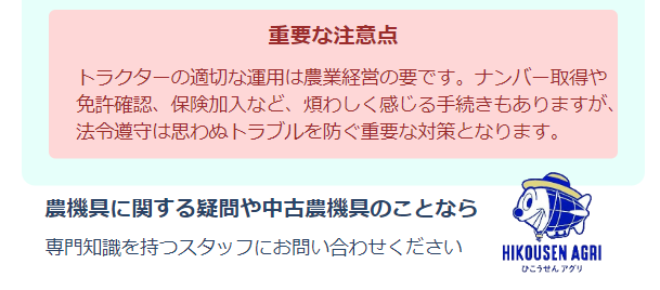 トラクターの適切な運用は農業経営の要です。ナンバー取得や免許確認、保険加入など、煩わしく感じる手続きもありますが、法令遵守は思わぬトラブルを防ぐ重要な対策となります。