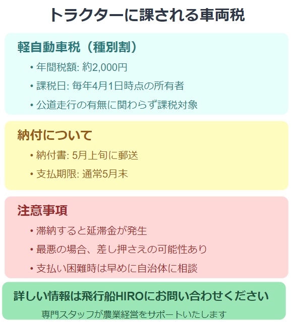 トラクターにも軽自動車税(種別割)が課されます。税額は年間2,000円程度で、毎年4月1日時点の所有者に課税されます。