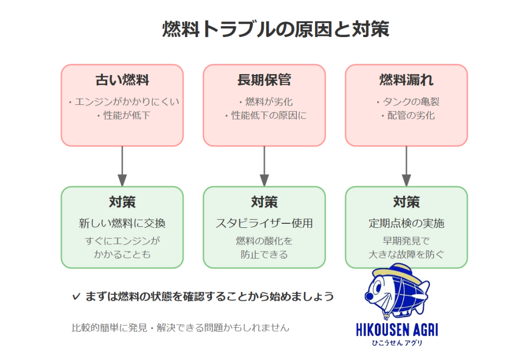 - 燃料が古いとエンジンがかかりにくくなる