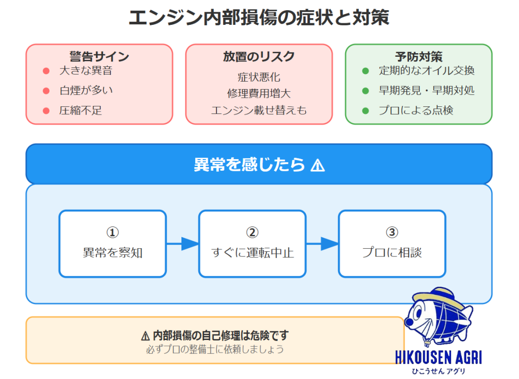 放っておくと状態が悪化し、大がかりな修理やエンジン載せ替えが必要になることも…。 - オイル管理が大切