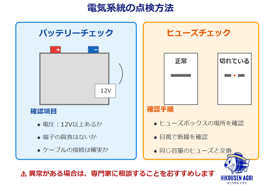 農機具は屋外での使用が多く、気温や湿度の影響で電気系統がトラブルを起こすことがあります。バッテリーやヒューズを一度点検してみると、思いがけない原因が見つかるかもしれません。