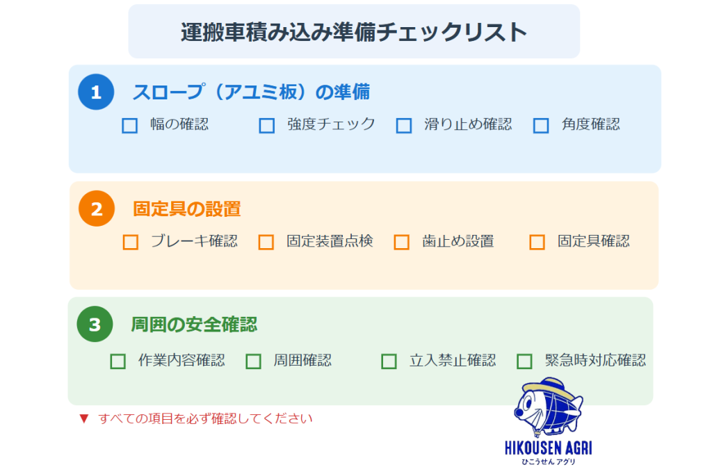 運搬車が通る幅を確保できるか、強度は十分かをチェックしましょう。 - 歯止めなどで固定