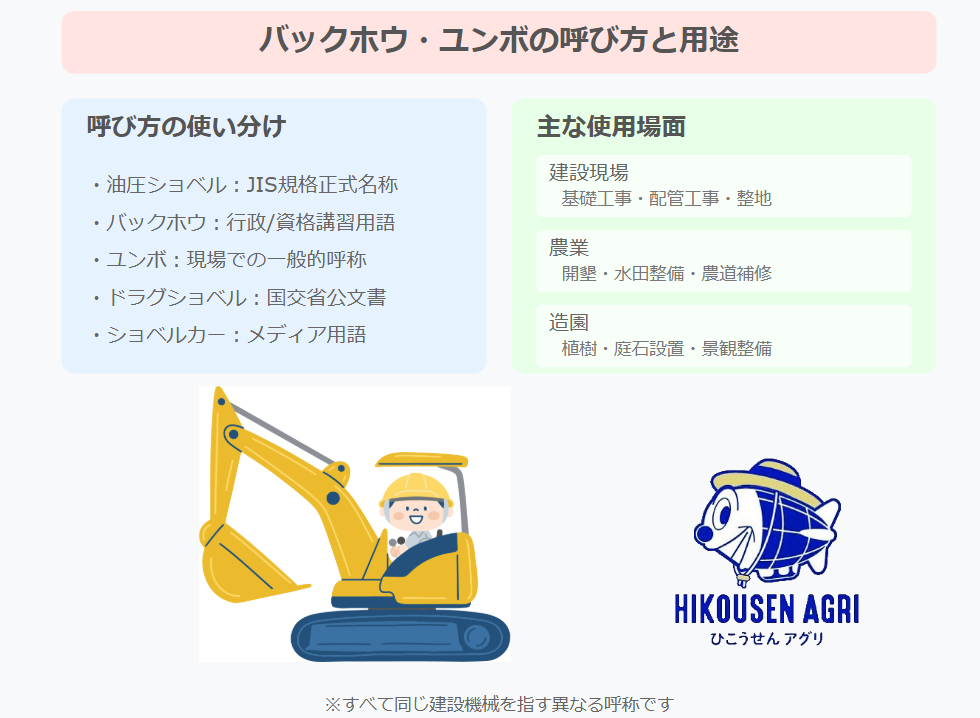 「バックホウ」は行政や法規での標準的な呼称で、資格講習でもこの名前が使われます。「ユンボ」は、シカム社の商標が一般化したもので、現場での通称として定着しています。 「ドラグショベル」は国交省の公文書で使用され、「ショベルカー」はメディアでよく使われる呼び方です。