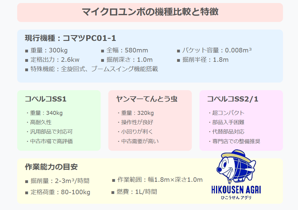 中古市場では、コベルコSS1(340kg)が高い人気を誇り、汎用部品での修理が可能な点が魅力です。また、ヤンマーのてんとう虫(320kg)は操作性の良さで知られ、生産終了後も高い必要があります。コベルコスSS2/1はさらにコンパクトですが、部品調達には注意が必要です。
