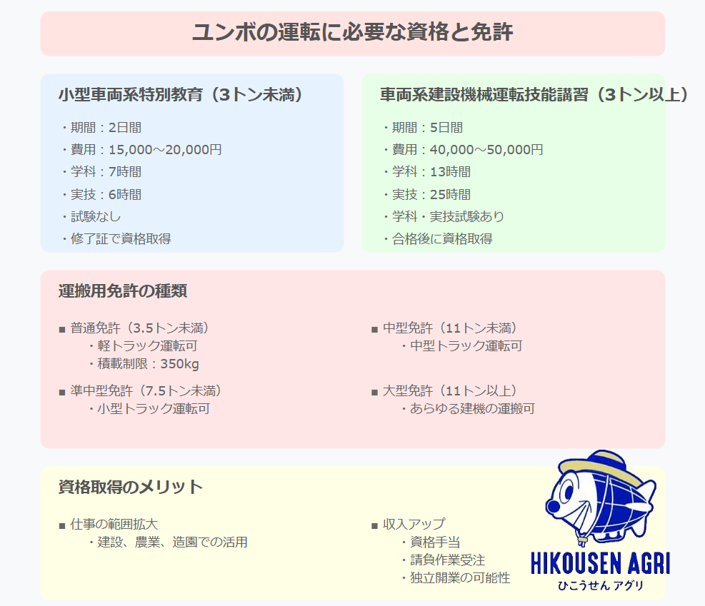 運搬面では、軽トラで運ぶマイクロユンボなら普通免許で十分ですが、積載制限350kgは必ず守る必要があります。より大きな建機を運ぶ場合は、車両の大きさに応じて準中型、中型、大型免許が必要となります。