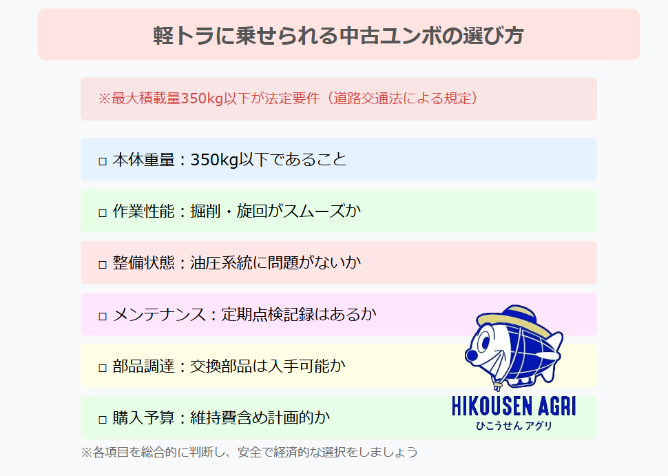 中古ユンボの購入は、法令遵守と安全性の確保が何より重要です。 特に軽トラでの運搬を考える場合、積載量制限は絶対に守らなければなりません。